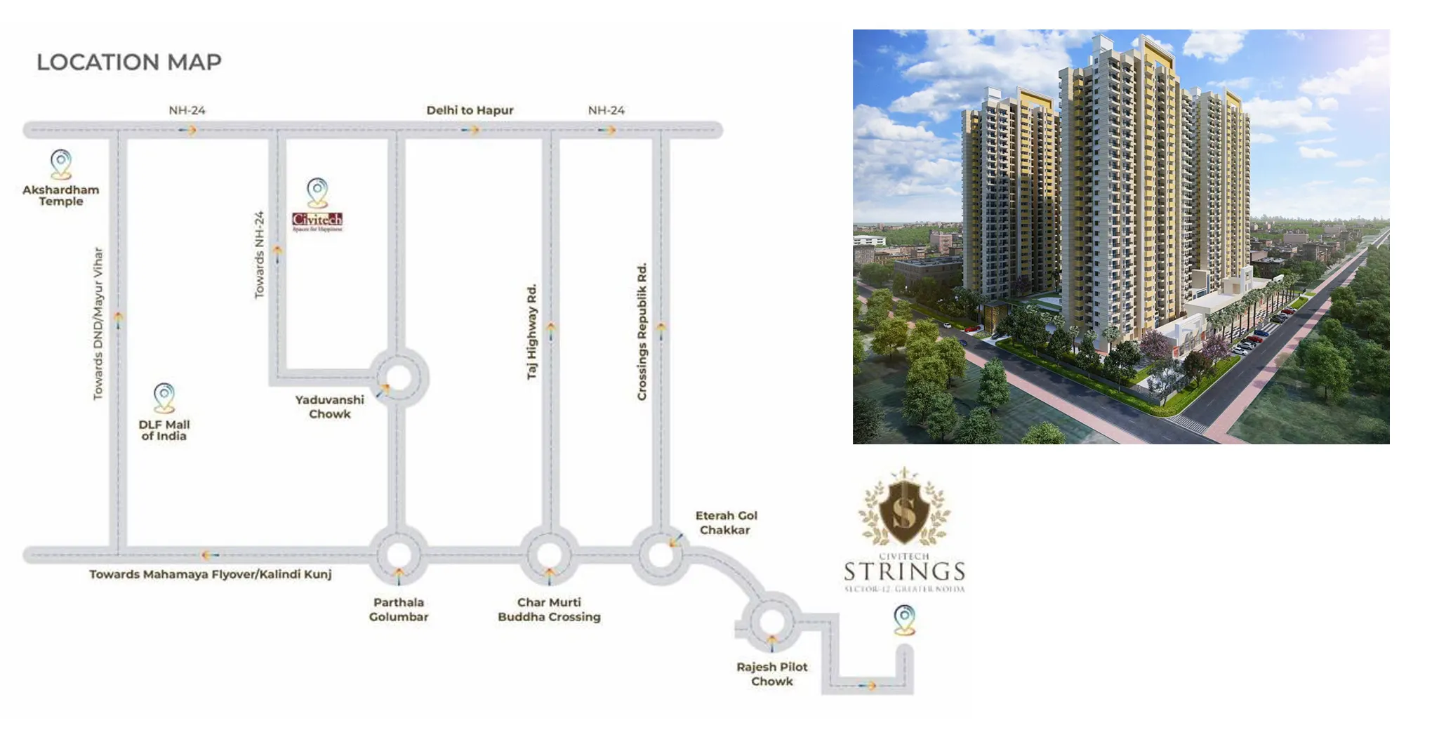 Civitech Strings is centrally located in the prime area of Noida having quick connectivity to banks, malls and commercial zones. Here, you will get a comfortable lifestyle in its well-made 2 BHK and 3 BHK luxurious apartments. Civitech Noida offers a safe and roomy living space surrounded by rich vegetation with a fully guarded community and four well-planned towers. The initiative is meant to provide happy living in the centre of a growing city so that daily serenity, security and luxury are given to the residents of this property. Civitech Strings is meant to provide neighbours with a nice living together with well chosen conveniences. The project offers children's play areas, a clubhouse, a gymnasium, well-kept gardens and lots of parking places among other things. From tastefully designed homes to open grassy areas, Civitech Strings Noida Extension has everything you need for a contented and laid-back lifestyle.